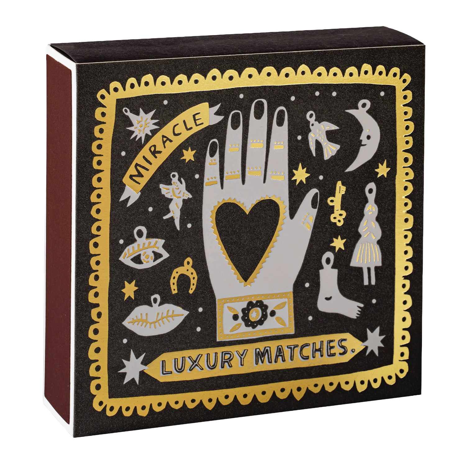 A square matchbox featuring the illustration of a hand with a heart in the middle surrounded by an array of different charms and gold foil detailing with the words 'Miracle Luxury Matches.' Designed with joy and a pallet of colourful gouache paints by artist and designer Lucy Brackin of Wanderlust Paper Co.